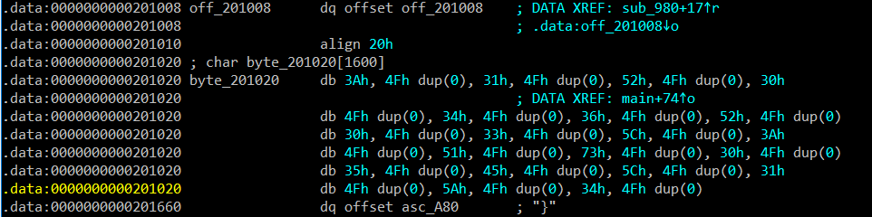 This conditional has algorithm XOR and i see byte_201020 elements at 0x201020