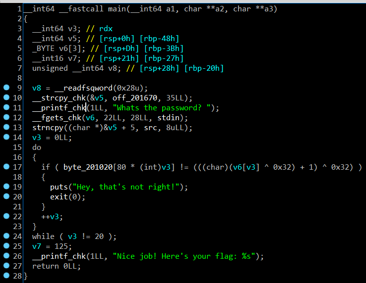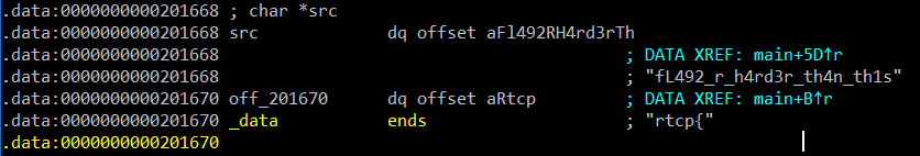 OK, i saw loop at line 15 to 24, you’ll see a conditional v3 != 20 it mean the length of password, so I started at line 10 and see off_201670 in a strcpy command, the off_201670 is returned result “rtcp{” and store in v5 variable . Then, in line 13 i see strncpy((char *)&v5 + 5, src, 8uLL), it mean it’ll copied v5 and src has 8 characters, the src i found it in IDA at address 0x201668 and 0x201670