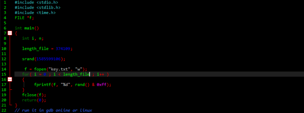 The key has 8 bits so rand() should be AND with 0xff and run it in linux because it work better than windows. After we got the keys, we’ll xor it to decrypt the file